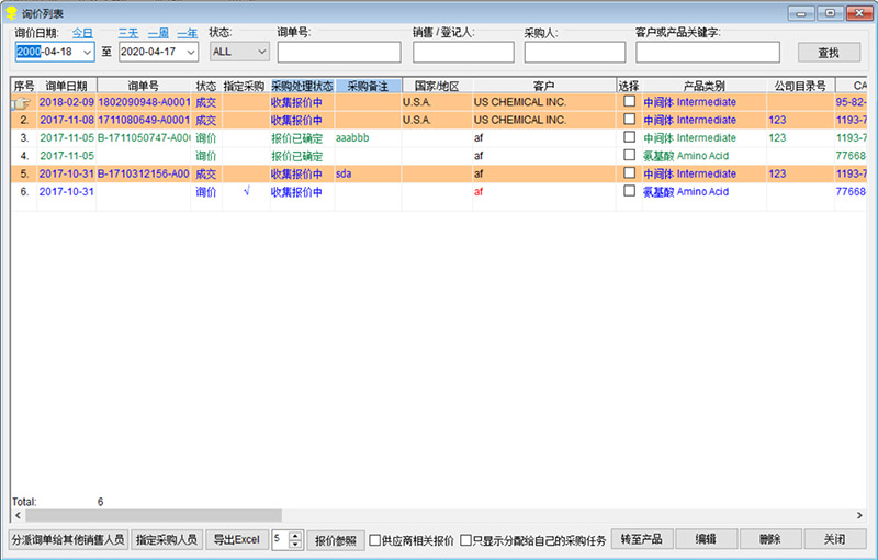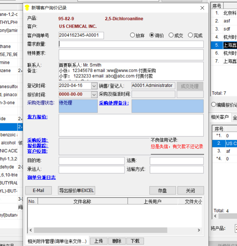 - 以化工行業(yè)客戶為主線,列出此客戶詢過價/購買過的相關產(chǎn)品,用戶只需輕點鼠標即可進行關聯(lián)產(chǎn)品或記錄報價.