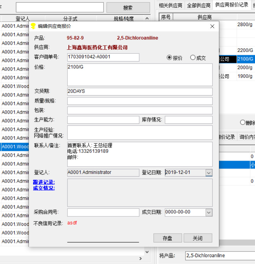 - 以化工產(chǎn)品(精細化學品、醫(yī)藥中間體、原料藥、農(nóng)藥、試劑、植物體取物行業(yè)都適用)為主線,使與此產(chǎn)品相關的供應商信息及報價,客戶相關信息及詢價記錄,一目了然的列示出來,用戶可輕點鼠標即可在打電話的同時記錄報價或詢價.