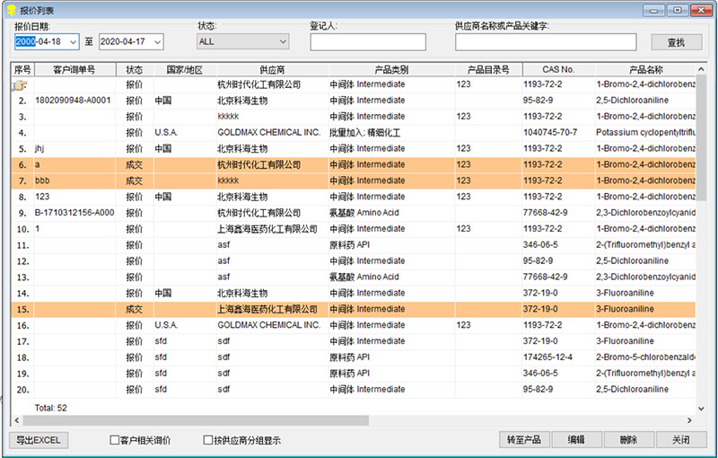 - 幾百到幾十萬條產(chǎn)品,以及相關客戶供應商與產(chǎn)品之間的供求關系及詢報價成交歷史一目了然,詢報價成交記錄查詢及業(yè)績統(tǒng)計,化工產(chǎn)品、客戶、供應商活躍度分析以便更好的銷售產(chǎn)品和服務客戶.