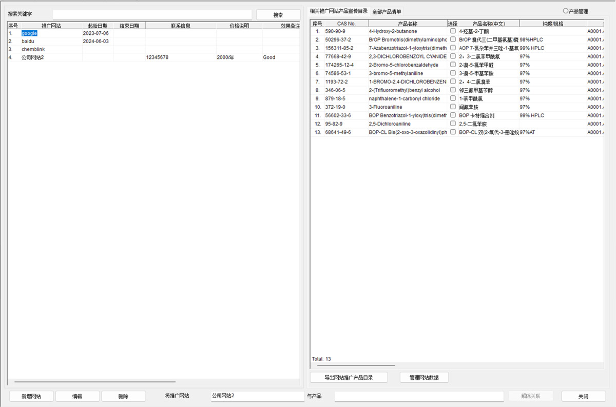 - 以化工醫(yī)藥行業(yè)供應(yīng)商為主線,列出此供應(yīng)商可供應(yīng)的相關(guān)產(chǎn)品,用戶只需輕點鼠標(biāo)即可進行關(guān)聯(lián)產(chǎn)品或報價操作.